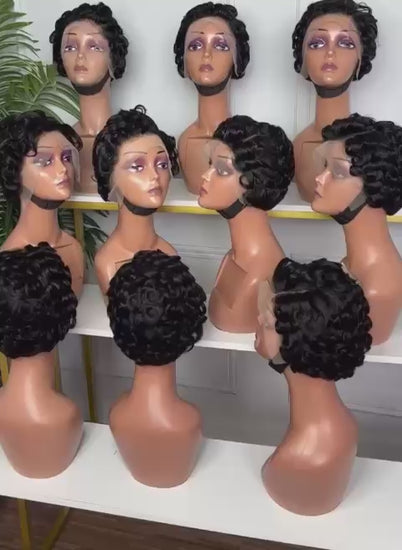 Perruque courte pixie à boucles définies, élégante, customisée avant expédition et prête à porter.
